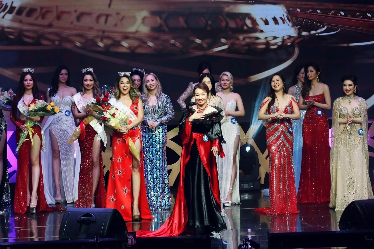 Tân Hoa hậu cùng các á hậu và thí sinh vui mừng trên sân khấu đăng quang