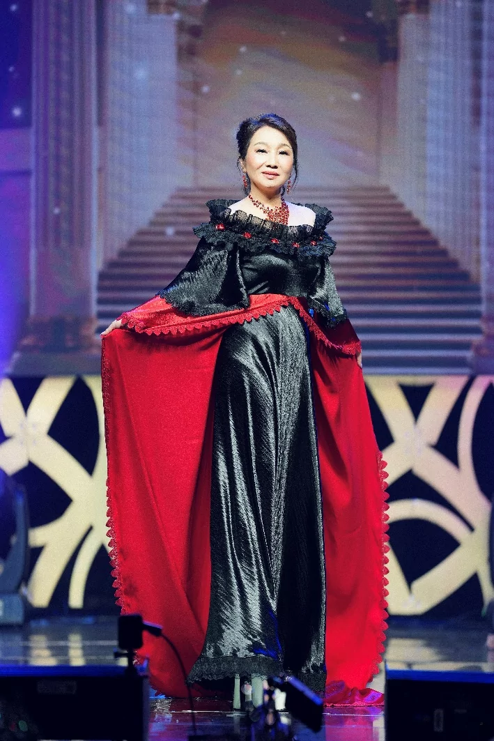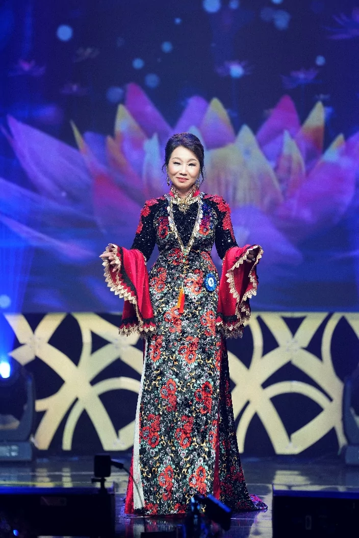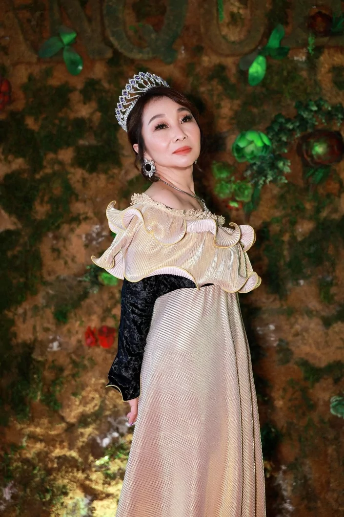 Nghệ sĩ Đức Xuân rạng rỡ trong trang phục áo dài và dạ hội