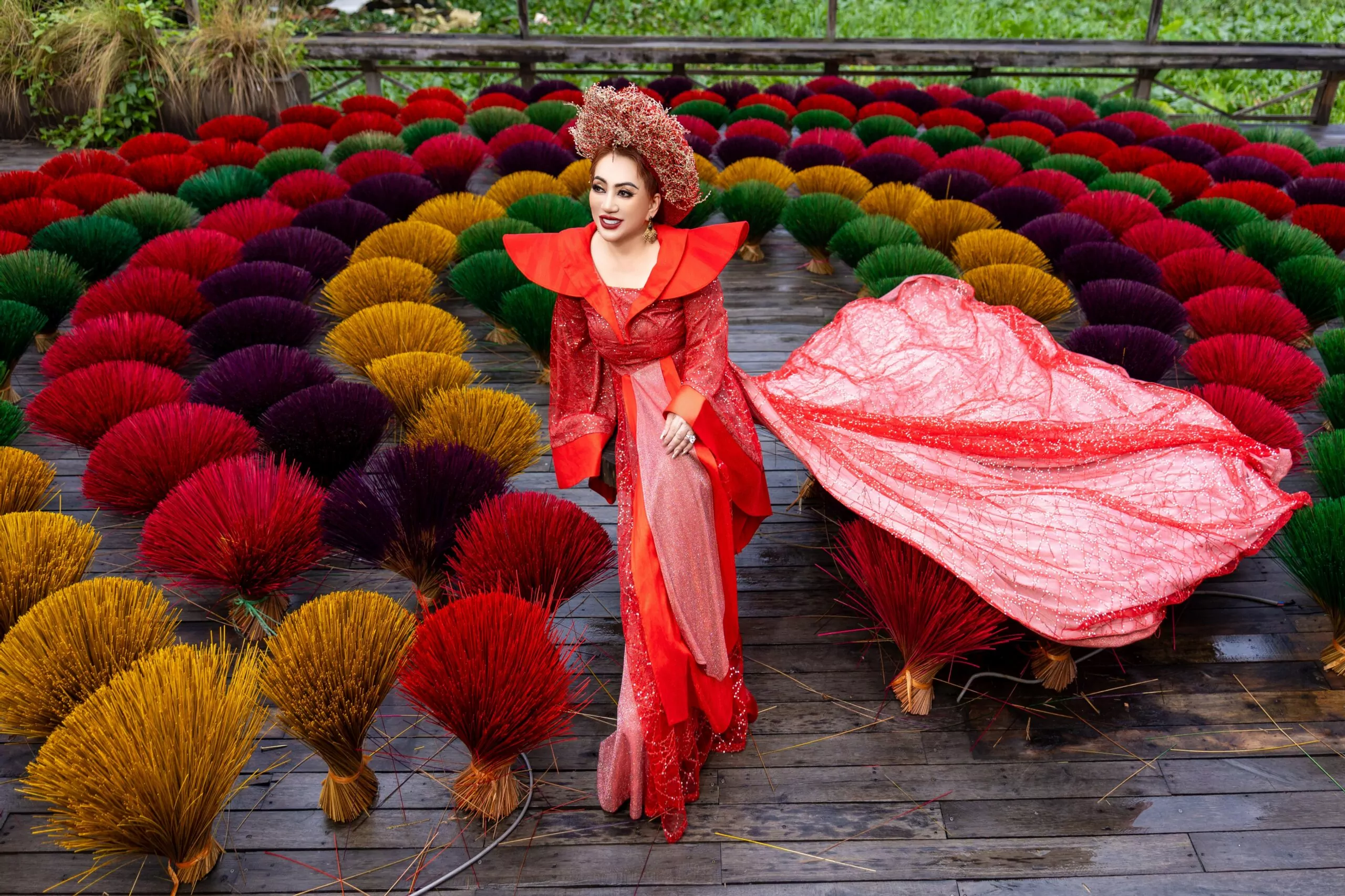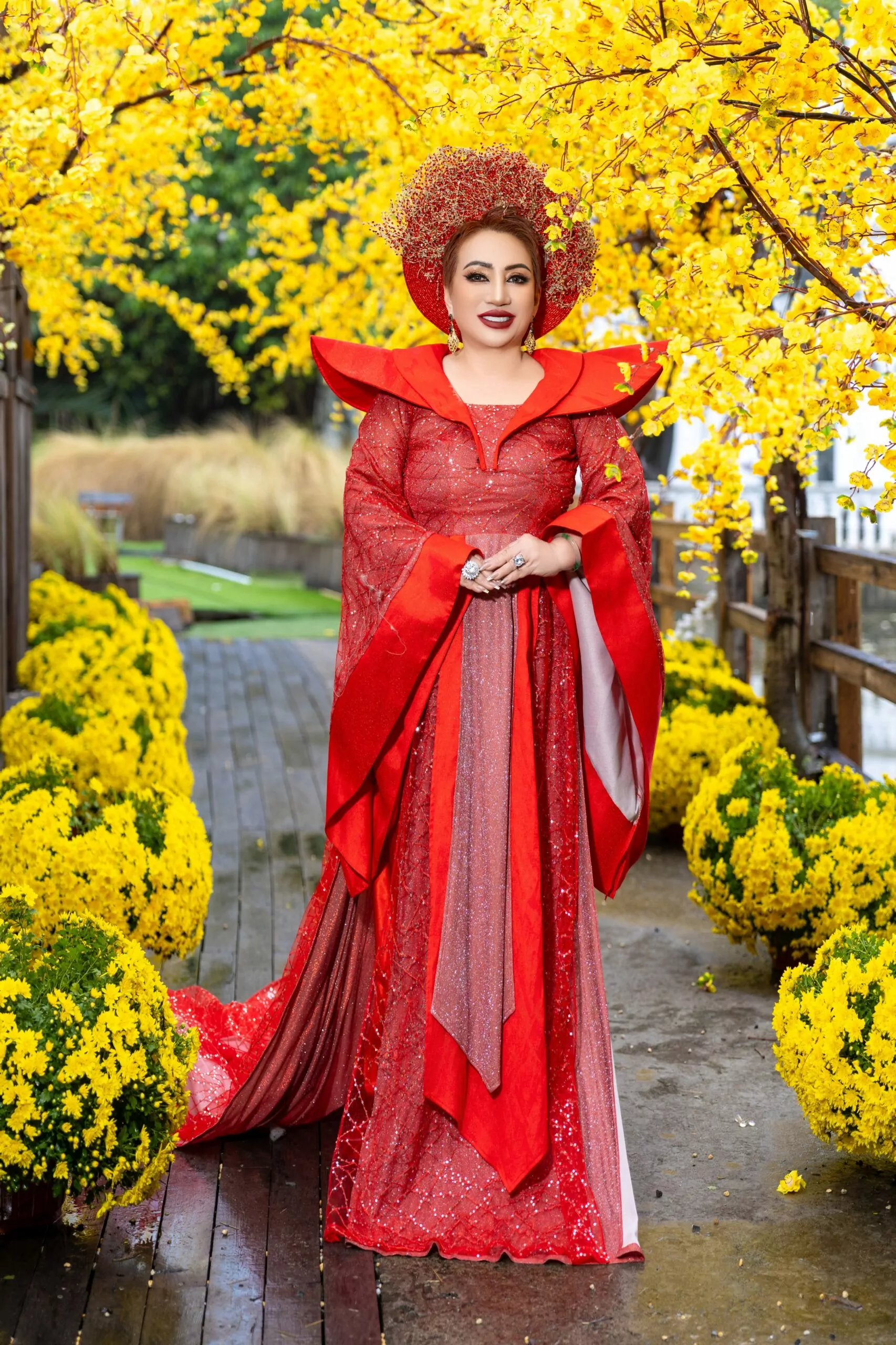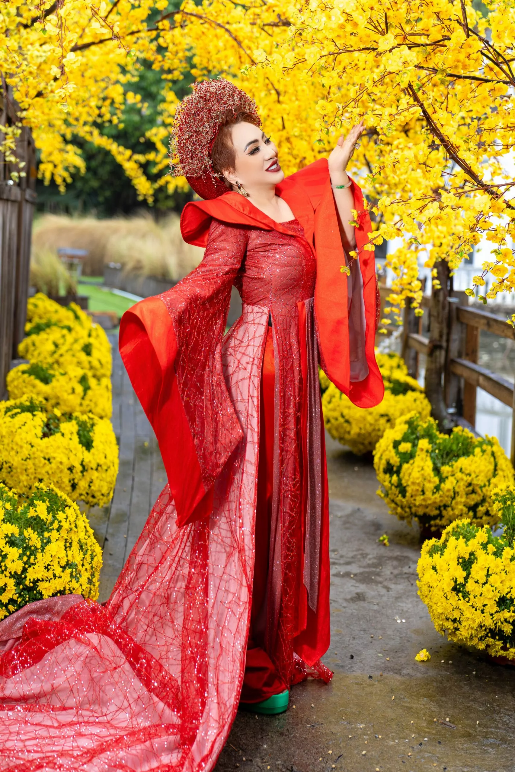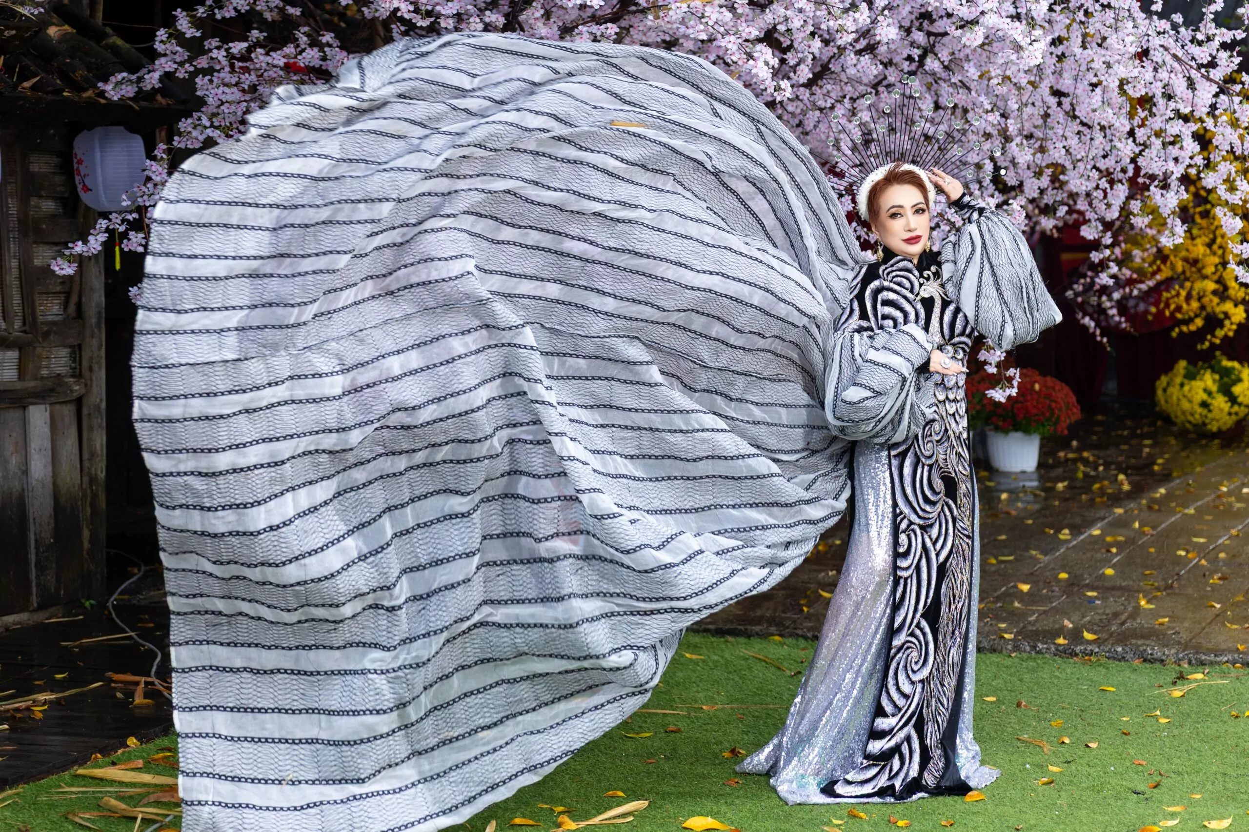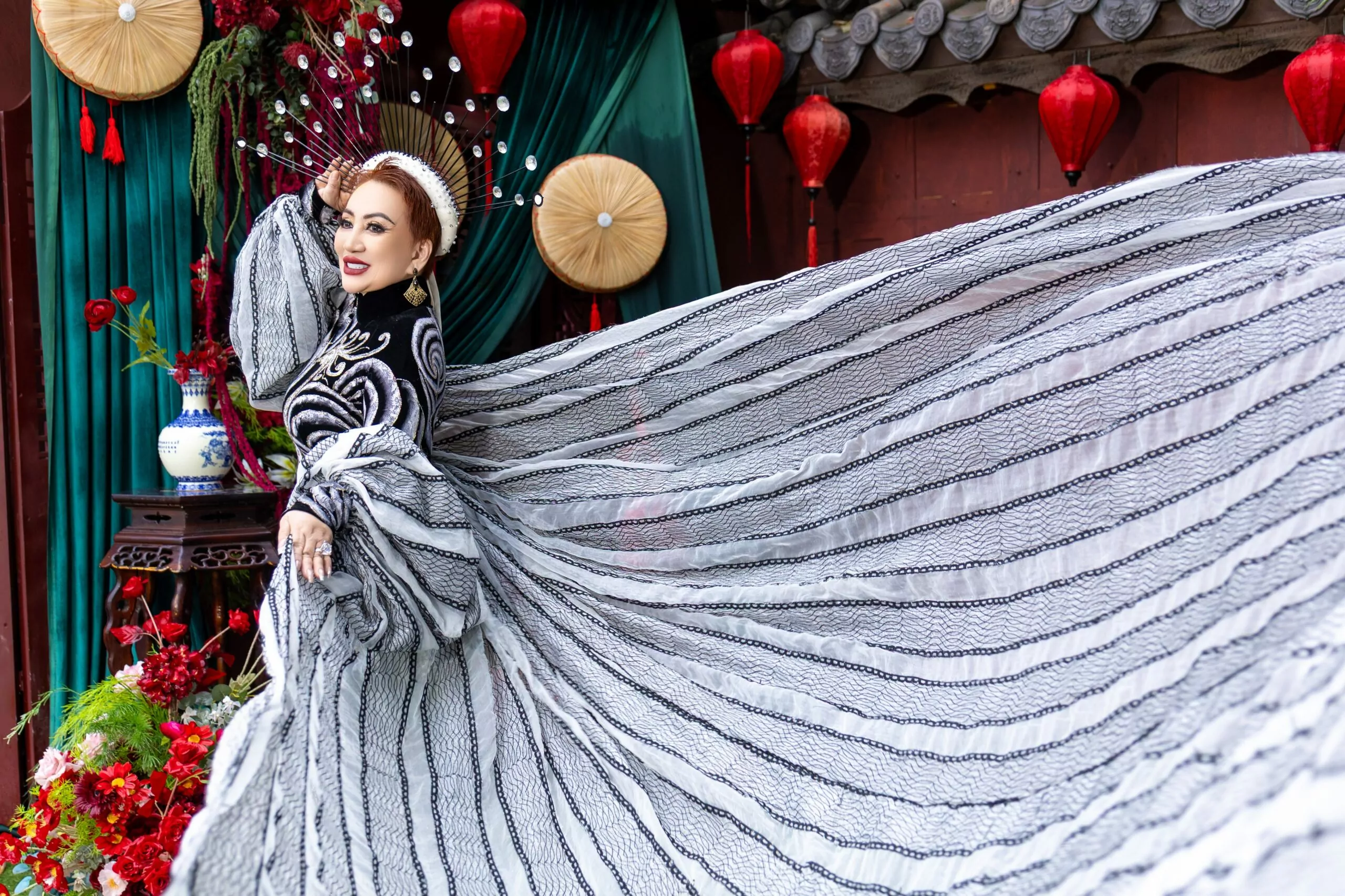 Bộ sưu tập áo dài mà Ly Ly Nguyễn thể hiện mang nhiều sắc thái và cung bậc cảm xúc khác nhau. Nếu thiết kế áo dài đen – trắng gợi lên vẻ đẹp huyền bí, sang trọng và kiêu sa, thì bộ áo dài sắc đỏ kết hợp cùng họa tiết mai vàng rực rỡ lại tượng trưng cho sự thịnh vượng, may mắn và thành công trong năm mới. Đặc biệt, thiết kế áo dài với tà rộng, nền vải trang nhã điểm xuyết hoa văn vàng óng ánh, kết hợp cùng phụ kiện đội đầu mang hơi hướng vương quyền đã giúp Hoa hậu Ly Ly Nguyễn toát lên thần thái của một nữ hoàng thực thụ – quyền lực nhưng vẫn dịu dàng, quyến rũ.